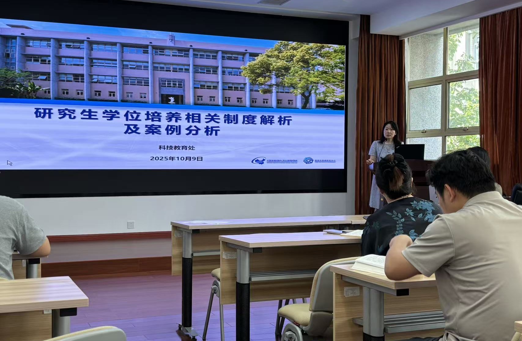 随后,科技教育处沈玉娟副处长进行《学位培养相关制度解析及案例分析》的专题授课。课程内容系统梳理了从招生录取、培养过程、学位授予到学生管理等方面的现行规章制度与政策要求,并结合实际工作中遇到的典型案例,对学术道德规范、学位论文质量把关等方面进行了深入浅出的讲解与剖析。