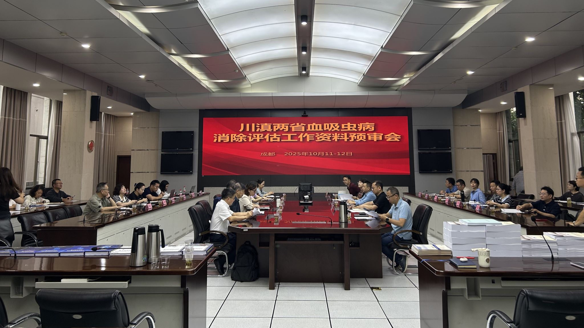 为做好四川、云南两省血吸虫病消除评估准备工作,中国疾控中心寄生虫病所于2025年10月11-12日在四川省成都市召开了川滇两省血吸虫病消除评估工作资料预审会。会议由血吸虫病室主任许静研究员主持,来自中国疾控中心寄生虫病所、中国农业科学院上海兽医研究所、复旦大学和重点防治省份约30名血吸虫病领域有关专家参加会议。