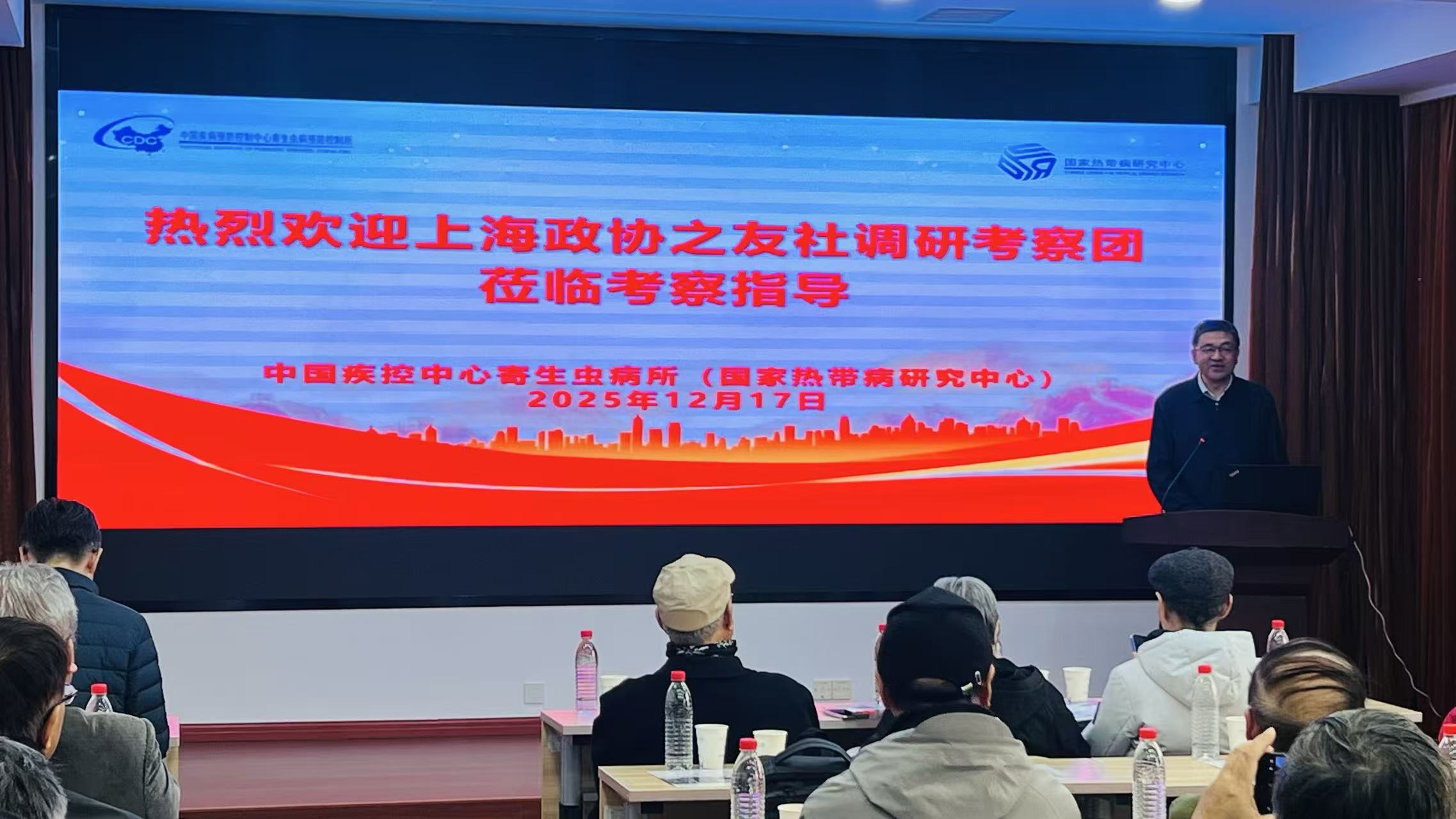 2025年12月17日,上海市政协之友社科技组陆晓春组长带领上海政协之友社调研考察团一行30余人来到中国疾控中心寄生虫病所考察调研。寄生虫病所党委书记刘海龙出席欢迎仪式。民盟上海市卫健委前主委郭家钢研究员、副主委曹淳力、二支部主委陈盈及本所民盟盟员代表等陪同调研。