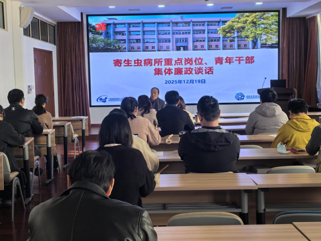 中国疾病预防控制中心寄生虫病预防控制所(国家热带病研究中心)(以下简称“寄生虫病所”)纪委于2025年12月19日上午召开集体廉政谈话会议,寄生虫病所纪委书记陈同年同志主持本次集体谈话,所内青年干部、重点岗位人员共22位代表参加本次谈话。
