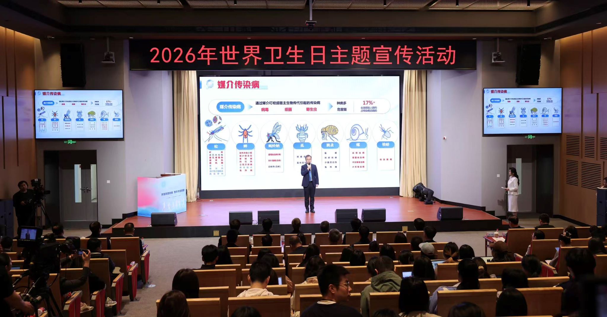 2026年4月7日,由国家卫生健康委主办,国家中医药局、国家疾控局协办,中国医学科学院承办的2026年世界卫生日宣传活动在京举行。今年世界卫生日的主题为“携手共促健康,坚定支持科学”,中国主题为“共享科技创新,携手共促健康”。中国疾病预防控制中心寄生虫病预防控制所(国家热带病研究中心)所长李石柱研究员受邀出席活动,并围绕“科学赋能,助力媒介传染病的控制与消除”作专题演讲,分享我国在媒介传染病防控领域的科技创新与实践成果。